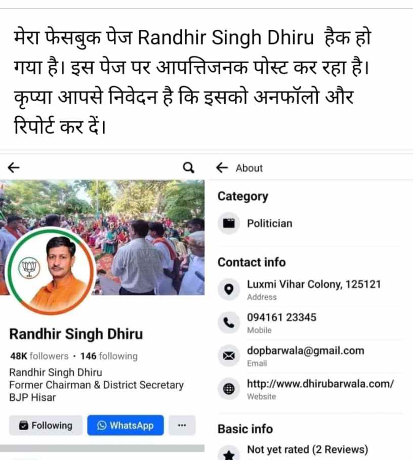 हिसार। भाजपा जिला उपाध्यक्ष एवं पूर्व चेयरमैन रणधीर सिंह धीरू का फेसबुक पेज हैक हो गया है। रणधीर सिंह धीरू ने इस बारे में पुलिस की साइबर क्राइम यूनिट को शिकायत दे दी है।