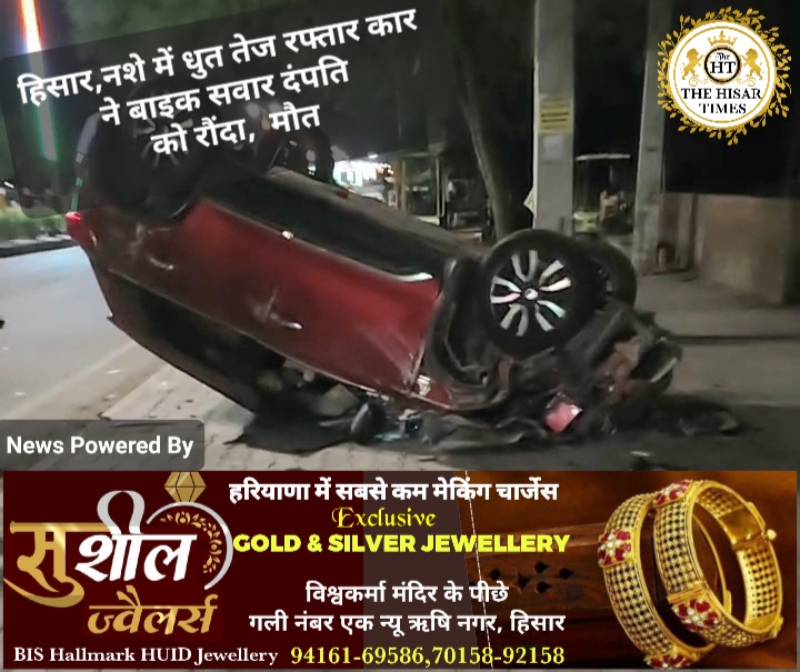हिसार, राजगढ़ रोड पर कोर्ट के समीप पेट्रोल पंप के सामने वीरवार देर रात करीब 11:00 बजे लाल रंग की तेज रफ्तार अनियंत्रित कार बाइक सवार दंपति के ऊपर चड़ी कार दंपति को रौंद कर पलट गई.बाइक सवार पति को गंभीर हालत में उपचार के लिए अस्पताल में दाखिल करवाया वहां पति की मौत हो गई और पत्नी की हालत गंभीर बनी हुई है
