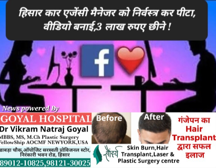 महिला ने कार एजेंसी मैनेजर को टाउन पार्क बुलाया वहां से वह उसे सुभाष नगर स्थित एक घर में ले गई ! 4 से 5 आदमियों ने कार एजेंसी मैनेजर को निर्वस्त्र कर पीटा वह उसकी वीडियो बनाई ! कार एजेंसी मैनेजर से 3 लाख लूटने के बाद 4.50 लाख रुपए और मांगे ! हिसार। … Continue reading हिसार,कार एजेंसी मैनेजर को निर्वस्त्र कर पीटा, वीडियो बनाई,3 लाख रुपए छीने !