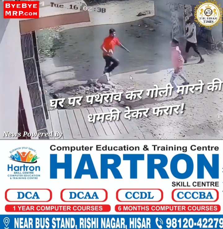 हिसार की जय श्री राम विहार कॉलोनी में चार से पांच युवकों ने घर पर ईटे व पत्थर बरसा घर की खिड़कियो के शीशे तोड़े और गेट को भी नुकसान पहुंचाया. जिस समय यह घटना हुई उस वक्त परिवार घर पर ही था घटना मंगलवार 4:00 बजे की बताई जा रही है घटना मकान में लगे सीसीटीवी कैमरे में कैद हो गई.जिसमें यह दिख रहा है की 2 बाइको पर सवार होकर चार से पांच युवक आते हैं और गालियां देते हुए गली में रखी ईंटें और पत्थर घर पर फेकते है.