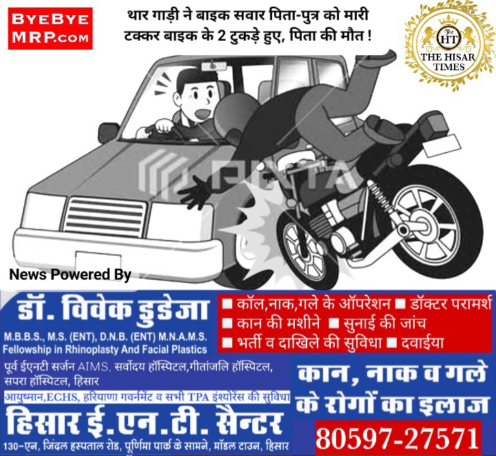वीरवार की सुबह हिसार राजगढ़ रोड़ पर आजाद नगर में एक दर्दनाक हादसा हो गया। यहां पर थार गाड़ी चालक ने बाइक को टक्कर मार दी। जिससे बाइक के दो टुकड़े हो गए और बाइक सवार पिता पुत्र में से पिता की मौत हो गई, जबकि उसका बेटा गंभीर रूप से घायल हो गया। पुलिस ने मृतक के परिजनों के ब्यान पर थार गाड़ी चालक के खिलाफ मामला दर्ज कर शव का हिसार के नागरिक अस्पताल में पोस्टमार्टम करवाकर परिजनों के हवाले कर दिया। पुलिस को दिए ब्यान में गांव रावत खेड़ा निवासी ईश्वर सिंह ने बताया कि वो हिसार की अनाज मंडी में नौकरी करता है।