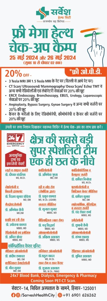▶सर्वेश हेल्थ सिटी में मतदान के दौरान उंगली पर लगी स्याही दिखाकर फ्री ओपीडी एवं रियायती दरों पर जांच का फायदा ले !