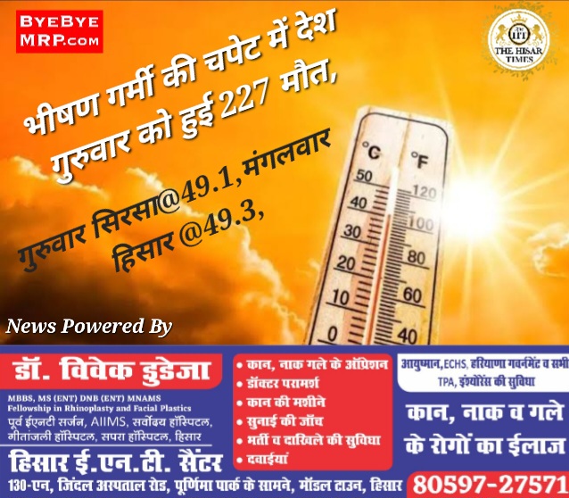 भीषण गर्मी की चपेट में देश गुरुवार को हुई 227 मौत,हरियाणा-गुरुवार सिरसा@49.1,मंगलवार हिसार @49.3,