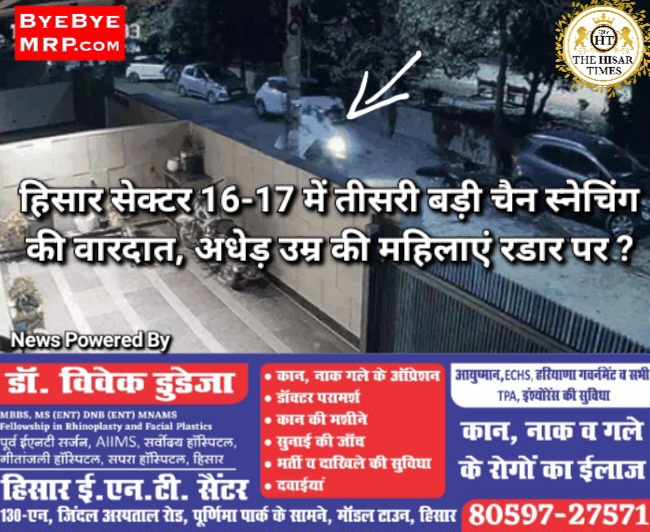 हिसार के सेक्टर 16-17 में लगातार चैन स्नैचिंग की वारदाते सामने आ रही है,बीते 30 दिनों में यह तीसरी बड़ी वारदात है शनिवार देर शाम सेक्टर 16-17 के मकान नंबर 1932 में रहने वाले सुनीता इवनिंग वॉक पर सेक्टर में ही घूम रही थी तभी करीब 7:30 बजे दो बाइक सवारी युवक आए और उसके गले से 3.5 तोले की चैन तोड़कर फरार हो गए. महिला ने शोर मचाया पर तब तक युवक काफी दूर जा चुके थे.