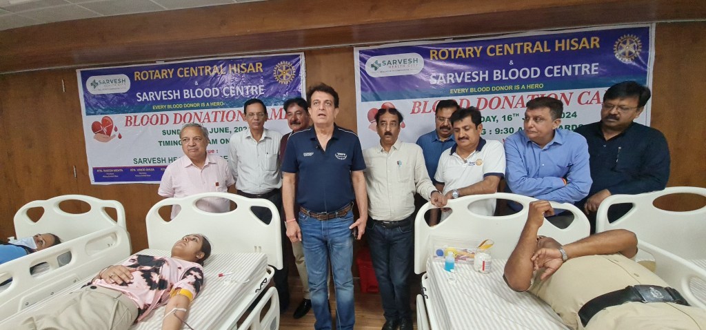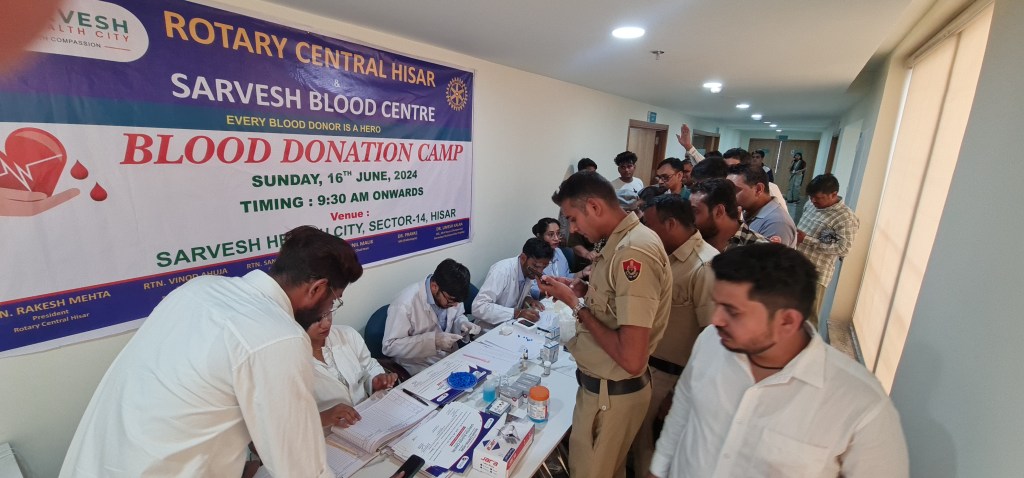 रोटरी सेंट्रल हिसार ने सर्वेश हेल्थ सिटी में रक्तदान शिविर का आयोजन किया जिसमें 120 से अधिक यूनिट रक्त एकत्रित किया गया इस अवसर पर स्वास्थ्य एवं उड्यन मंत्री डॉ कमल गुप्ता ने मुख्य अतिथि के तौर पर शिरकत की. साथ ही अंडर-19 क्रिकेट वर्ल्ड कप के हीरो रहे विकेटकीपर बैट्समैन दिनेश बाना भी अतिथि के रूप में पहुंचे.सर्वेश हेल्थ सिटी के चेयरमैन डॉ उमेश कालरा,डॉ सरिता कालरा व डायरेक्टर डॉ राजकुमार आहूजा ने सर्वप्रथम अतिथियों को पुष्प गुच्छ देकर स्वागत किया तत्पश्चात रिबन काट एवं दीप प्रचलित कर रक्तदान शिविर का शुभारंभ किया गया. डॉ कालरा ने कहा कि रक्तदान को महादान कहा जाता है। नियमित रक्तदान से न सिर्फ आप खून की जरूरत वाले लोगों की जान बचा सकते हैं, साथ ही इस एक आदत से आपकी सेहत को भी कई प्रकार से लाभ होता है। हमारे द्वारा किए गए रक्तदान से कई लोगों की जिंदगी बचती है।
