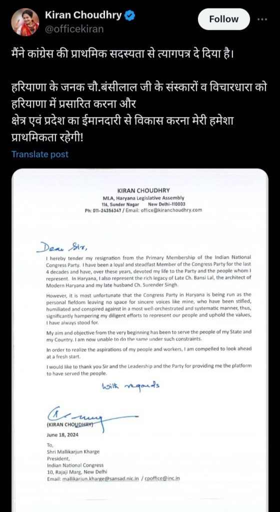 किरण चौधरी और श्रुति चौधरी ने कांग्रेस अध्यक्ष मल्लिकार्जुन खड़गे को अपना त्यागपत्र भेज दिया है और इसमें किरण चौधरी ने कांग्रेस की प्राथमिक सदस्यता से त्यागपत्र देते हुए कहा है कि हरियाणा में कांग्रेस पार्टी व्यक्तिगत जागीर बन गई है, जिससे मेरी जैसी ईमानदार आवाजों के लिए कोई जगह नहीं बची है.किरण के कांग्रेस से अलगाव का बीज चरखी दादरी में हुई रैली में राहुल गांधी के सामने ही पड़ गया था, क्योंकि ऐन चुनाव के वक्त किरण और राव दान सिंह के बीच तल्खी सार्वजनिक हो गई थी और चुनाव के बाद राव दान सिंह ने साथ नहीं देने का आरोप भी लगाया था। किरण चौधरी लोकसभा चुनावों में भिवानी महेंद्रगढ़ सीट से अपनी बेटी श्रुति चौधरी के लिए टिकट मांग रही थी लेकिन केंद्रीय हाईकमान ने उनकी जगह पर राव दान सिंह को प्रत्याशी घोषित किया था. वहीं, चुनाव प्रचार के दौरान भी जमकर गुटबाजी चरम पर रही. प्रचार के दौरान भी वो नदारद रही थी.