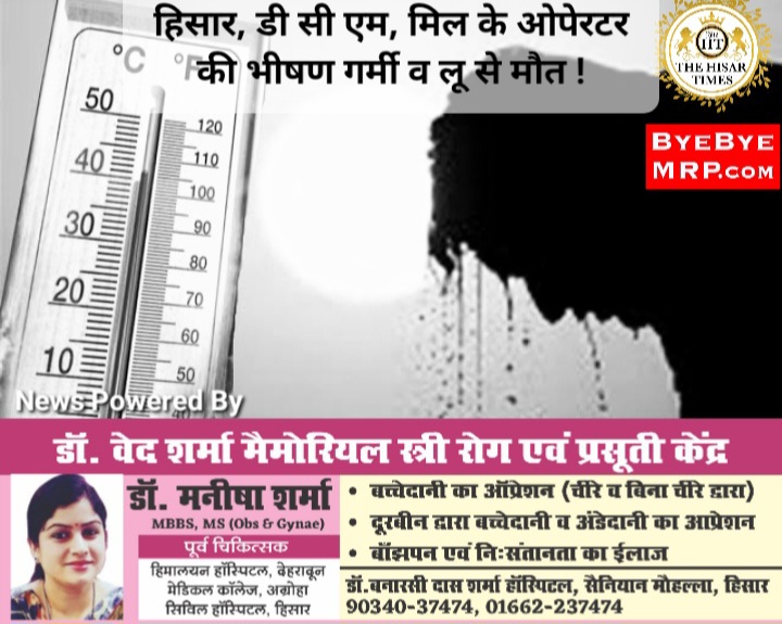 पिछले कई दिनों से चल रही भीषण गर्मी और लू की चपेट में आकर बुखार से पीड़ित हिसार डी सी एम मिल में ऑपरेटर के पद पर कार्यरत दीपक कुमार यादव उम्र 36 वर्ष जो की डीसीएम मिल की आवासीय कॉलोनी में ही रहता था की मौत हो गई। एचटीएम थाना पुलिस ने शव का नागरिक अस्पताल में पोस्टमार्टम करवाकर परिजनों को सौंप दिया। पुलिस ने मृतक के भाई के बयान पर इत्तफाकिया कार्रवाई की है।