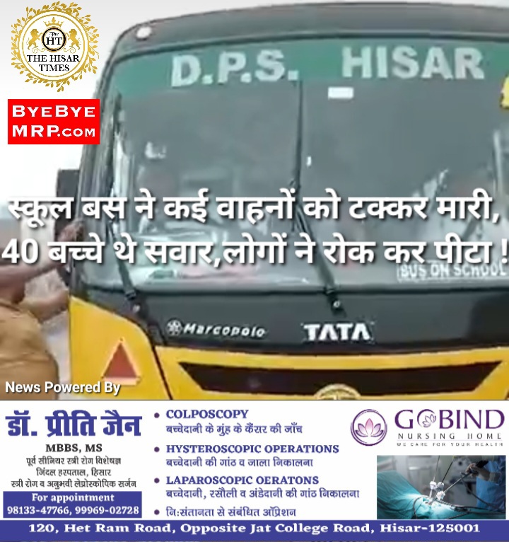 हिसार, दिल्ली हिसार नेशनल हाईवे पर गांव मय्यड़ के पास DPS School Bus ने एक के बाद एक कई वाहनों को टक्कर मार दी और बस की चपेट में आने से एक बाइक सवार गंभीर रूप से घायल हो गया जिसे उपचार के लिए अस्पताल में भर्ती करवा गया है। हादसे की सूचना मिलते ही … Continue reading स्कूल बस ने कई वाहनों को मारी टक्कर,40 बच्चे थे सवार,लोगों ने रोक कर पीटा !