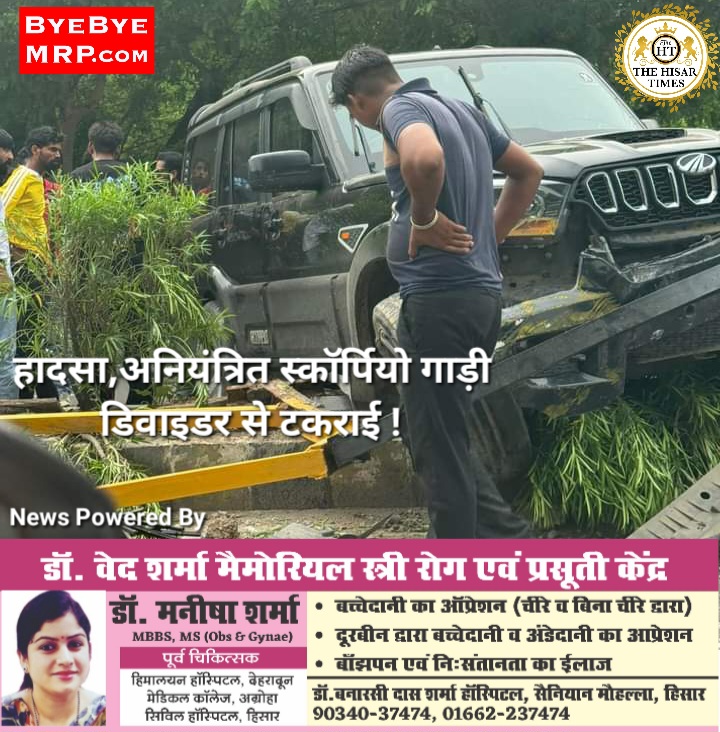 हिसार,राजगढ़ रोड पर काले रंग की स्कॉर्पियो गाड़ी अनियंत्रित होकर डिवाइडर से टकरा गई. यह हादसा राजगढ़ रोड पर आजाद नगर से फव्वारा चौक की तरफ जाते समय हुआ गनीमत यह रही की स्कॉर्पियो में सवार सभी लोग बाल बाल बच गए लेकिन गाड़ी सहित सरकारी संपत्ति को नुकसान हुआ है घटना वीरवार शाम 5:00 बजे की है. इस मामले में PLA,HAU व कोर्ट परिसर चौकी से संपर्क करने पर पता चला कि उनके पास कोई सूचना नहीं आई है !