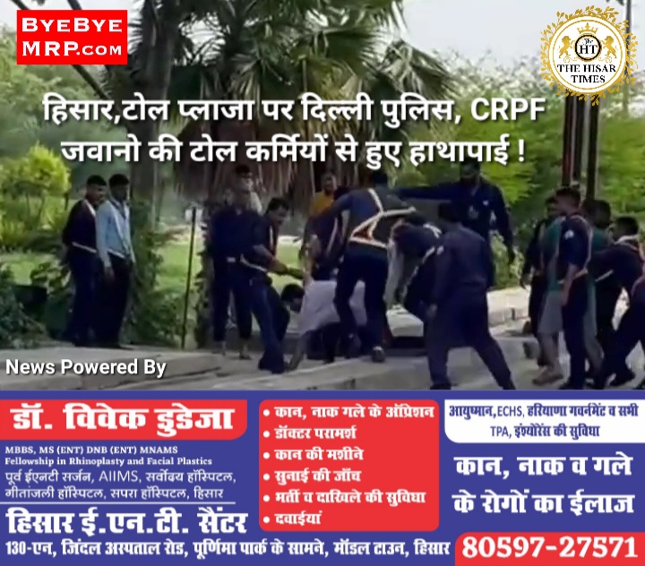 हिसार,बाडो पट्टी टोल प्लाजा पर दिल्ली पुलिस और CRPF के जवानों का टोल कर्मियों से झगड़ा हो गया। यह विवाद टोल पार करने को लेकर हुआ। घटना के दो वीडियो सामने आए हैं। पहला वीडियो CCTV फुटेज का है, जिसमें कार सवारों और टोल कर्मियों के बीच बहस हो रही है। थोड़ी देर बाद ड्राइवर कार को तेजी से निकालता है, जिससे टोल कर्मी साइड में गिर जाता है। यह घटना शनिवार की बताई जा रही है