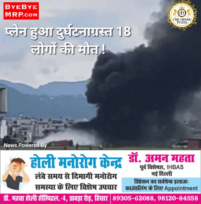नेपाल की राजधानी काठमांडू में एक विमान क्रैश हो गया है। प्लेन में सवार 19 लोगों में से 18 की मौत हो गई है। वहीं घायल पायलट कैप्टन एम. शाक्य को गंभीर हालत में अस्पताल पहुंचाया गया है। प्लेन काठमांडू से पोखरा जा रहा था।प्लेन ने सुबह करीब 11 बजे त्रिभुवन एयरपोर्ट से उड़ान भरी। इसके कुछ ही देर के अंदर यह क्रैश हो गया। 9N-AME प्लेन सौर्य एयरलाइन्स का था। हादसे में मारे गए लोगों में से 17 सौर्य एयरलाइंस के ही स्टाफ थे, जबकि बाकी 2 क्रू मेंबर्स थे।