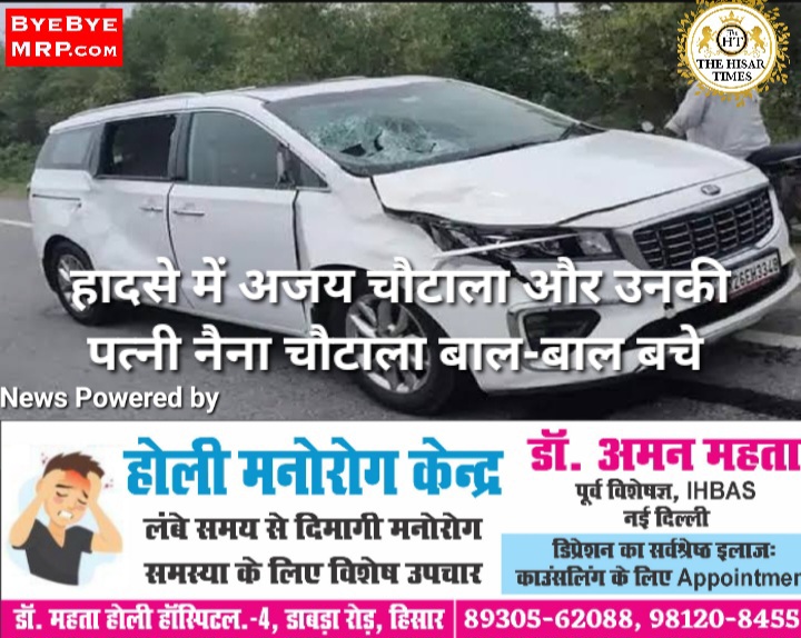जननायक जनता पार्टी (JJP) के राष्ट्रीय अध्यक्ष अजय चौटाला की गाड़ी शुक्रवार को दुर्घटनाग्रस्त हो गई। हादसे में अजय चौटाला और उनकी पत्नी नैना चौटाला बाल-बाल बच गए हैं। यह हादसा नेशनल हाइवे हिसार-चंडीगढ़ रोड पर हुआ है। गाड़ी से नील गाय के टकराने की वजह से हादसा हुआ है। हादसे के वक्त अजय चौटाला अपनी पत्नी नैना चौटाला के साथ सिरसा की तरफ से चंडीगढ़ जा रहे थे। इसी बीच रास्ते में नील गाय आ गई और यह हादसा हुआ।