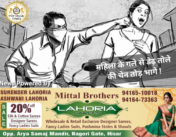 Hisar Times News : शहर में एक बार फिर से बाइक सवार झपट मार सक्रिय हो गए हैं सेक्टर 9-11 में गुरुवार देर शाम करीब 9:00 बजे सैर पर निकली महिला के गले से झपट्टा मारकर करीब डेढ़ तोला सोने की चेन पल्सर बाइक सवार तोड़कर ले गए. महिला ने शोर मचाया लेकिन आरोपी फरार हो चुके थे. इस वारदात की सूचना मिलने पर अर्बन स्टेट थाना पुलिस मौके पर पहुंची पीड़ित महिला से जानकारी लेकर झपट मारो की धर पकड़ के लिए प्रयास किया जा रहे हैं.