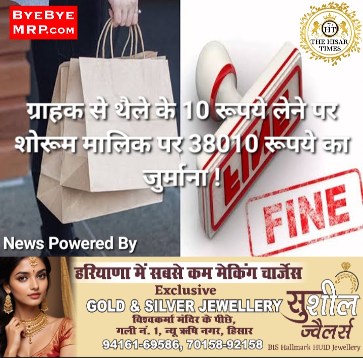 हिसार, शोरूम मालिक को ग्राहक को खरीदारी करने पर भी थैला ना देना काफी महंगा पड़ गया.मामले की जानकारी देते हुए शिकायतकर्ता एडवोकेट नवीन धमीजा ने बताया कि 14 अगस्त 2022 को शोरूम पर जाकर 3541 रुपए के कपड़े खरीदे थे. लेकिन बिल 3551 रुपए का थमाया बिलिंग काउंटर पर ₹10 लेने बारे में पूछा गया तो जवाब मिला की थैली के पैसे लिए गए हैं. उन्होने कहां की है यह गलत है तो कहां की यह तो देने ही पड़ेंगे.