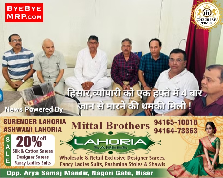 हिसार के रामपुरा मोहल्ला निवासी पंकज शर्मा जो कि चंदन नगर में होम क्लीनिंग प्रोडक्ट की फैक्ट्री चलाते हैं को बीते दिनों में चार बार बाइक सवारों ने गाड़ी रुकवा कर जान से मारने की धमकी दी.व्यापारी के अनुसार उन्होंने पुलिस को अलग-अलग जगह पर दो बार शिकायत दर्ज करवाई है पर अब तक पुलिस की तरफ से कोई कार्रवाई नहीं की गई