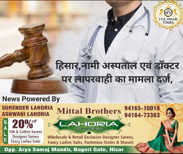 हिसार शहर के एक नामी अस्पताल संचालक एवं डॉक्टर पर पुलिस ने आज लापरवाही का मामला दर्ज किया है पुलिस ने चरखी दादरी निवासी भूपेंद्र सिंह की शिकायत पर यह करवाई की गीतांजली अस्पताल के संचालक सहित डॉक्टर यशपाल सिंगला के खिलाफ मामला दर्ज किया है। डॉक्टर यशपाल सिंगला ने वर्ष 2018 में चरखी दादरी … Continue reading हिसार,नामी अस्पताल के संचालक एवं डॉक्टर पर लापरवाही का मामला दर्ज, इलाज में मरीज की जमीन जायदाद बिकी !