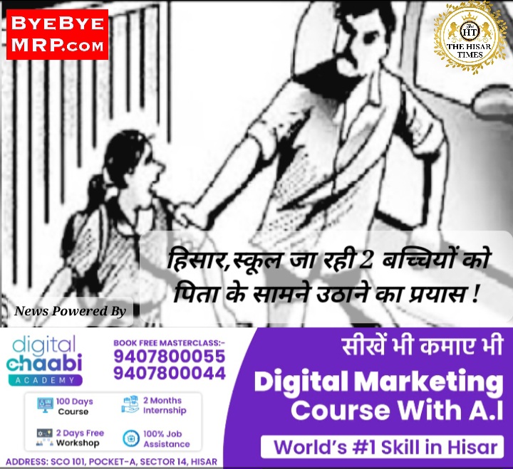 हिसार,शहर के एक मोहल्ले में बुलेट मोटरसाइकिल सवार एक युवक ने स्कूटी सवार अपने साथी की मदद से दो बच्चियों के अपहरण का प्रयास किया. वह पहले बच्चियों का पीछा करता था. हिसार शहर के मोहल्ले में रहने वाले एक व्यक्ति ने पुलिस को शिकायत देकर कहा कि उसकी 13 वर्षीय और 6 वर्षीय बेटी सुबह स्कूल में जाने के लिए चौक पर जाती हैं. वहां स्कूल बस आती है और बुलेट मोटरसाइकिल सवार एक युवक उनको रोज रोकता है और पीछा करता है.