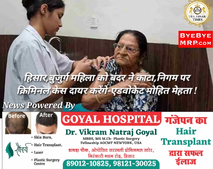 हिसार,बुजुर्ग महिला को बंदर ने काटा,निगम पर क्रिमिनल केस दायर करेंगे-एडवोकेट मोहित मेहता !