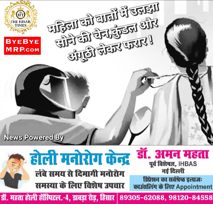 हिसार। बुधवार सुबह लगभग 7:00 बजे सेक्टर 16-17 में रहने वाली एक महिला लिलो देवी को बातों में उलझा कर सोने की चेन, कानों के कुंडल और अंगूठी लेकर फरार हो गए। महिला रोजाना की तरह घर से निकल कर चीटियों को आटा डालने जा रही थी पुलिस को दी गई शिकायत में सेक्टर 16-17 की रहने वाली पूनम ने बताया कि पति विरेंद्र शहर से बाहर नौकरी करते हैं। सास लीलो देवी रोजाना सुबह चींटियों को आटा देने जाती हैं। बुधवार सुबह सास घर से निकली थी। रास्ते में मकान नंबर 921 के पास दो युवक मिले। दोनों ने लीलो देवी को बातों में उलझा लिया और गले से सोने की चेन, कानों से कुंडल और सोने की अंगूठी निकलवा ली। घर जाकर लीलो देवी ने पुत्रवधू को इस बारे में बताया। सिविल लाइन थाना पुलिस ने अज्ञात के खिलाफ केस दर्ज कर जांच शुरू कर दी है। पुलिस आसपास लगे सीसीटीवी कैमरों को खंगालकर आरोपियों का सुराग लगाने का प्रयास कर रही है।