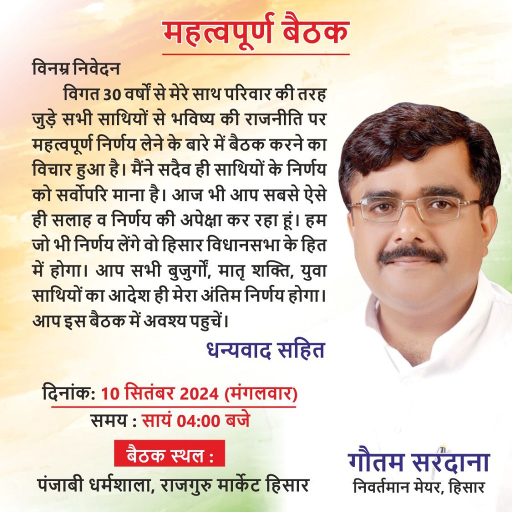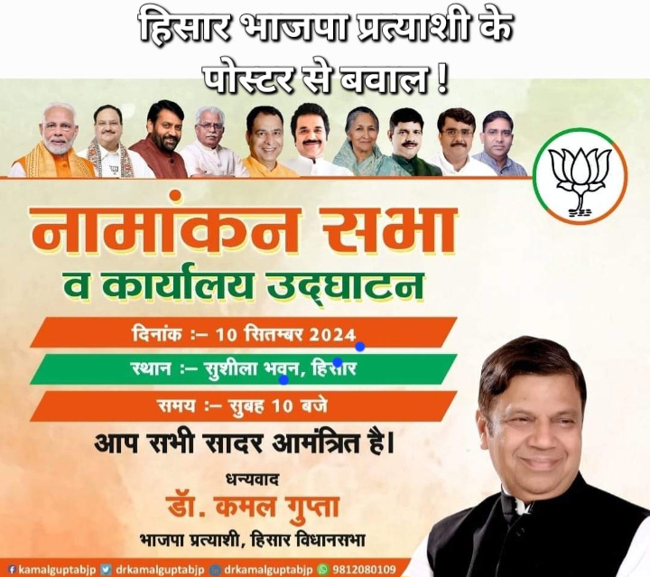 हिसार से BJP प्रत्याशी डॉ कमल गुप्ता ने अपना नामांकन भरने की तारीख का ऐलान किया है वह हरियाणा सरकार में सेहत मंत्री भी है। डॉ. गुप्ता 10 सितंबर को सुबह 10 बजे अपना नामांकन दाखिल करेंगे। उनके नामांकन पोस्टर से बवाल मच गया है मंत्री गुप्ता ने अपने नामांकन पोस्टर में बीजेपी से बगावत कर चुकी सावित्री जिंदल और पूर्व मेयर गौतम सरदाना का फोटो भी साथ में लगा दिया इस पोस्टर में हिसार से भाजपा का टिकट ना मिलने के कारण बागी हो चुके नेताओं की फोटो मुख्यमंत्री नायब सैनी और पूर्व सीएम मनोहर लाल के साथ लगाई है।