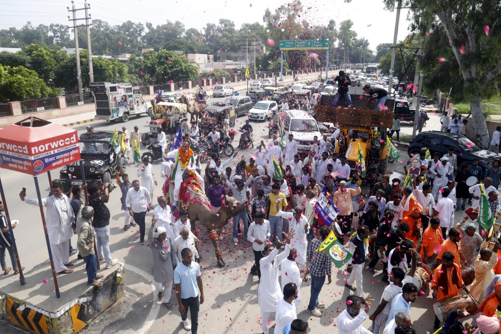 हिसार, नलवा विधानसभा क्षेत्र से जननायक जनता पार्टी के प्रत्याशी वीरेंद्र चौधरी ने मंगलवार को अपना नामांकन पत्र दाखिल किया। आजाद नगर स्थित मनवार बैंक्वेट हॉल से भारी जुलूस के साथ लघुसचिवालय पहुंचे चौधरी ने नामांकन से पहले ही विरोधियों के हौंसले फाख्ता कर दिए। उंट पर सवार वीरेंद्र चौधरी का विभिन्न स्थानों पर गर्मजोशी व फूलों की वर्षा के साथ स्वागत किया गया। भारी भीड़ से गदगद वीरेंद्र चौधरी भाव विभोर नजर आए और क्षेत्रवासियों से मिले प्यार को सूद सहित लौटाने का वादा किया।