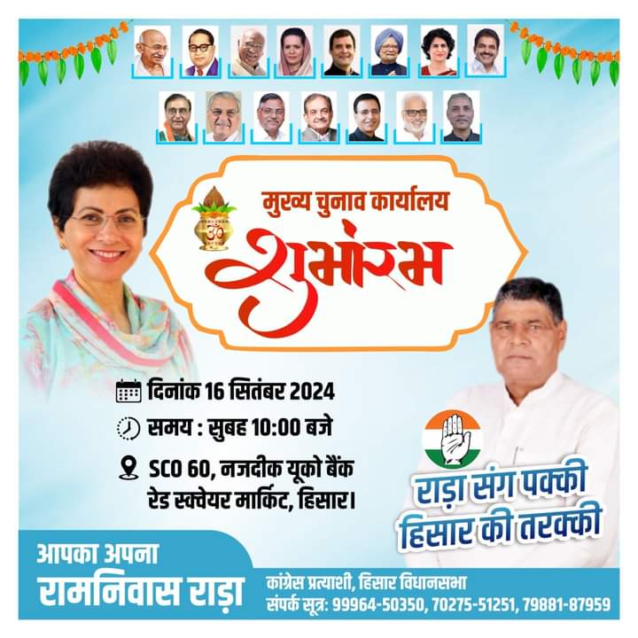 ✍️सावित्री जिंदल के चुनाव कार्यालय का शुभारंभ आज – हिसार विधानसभा से निर्दलीय प्रत्याशी सावित्री जिंदल के चुनावी कार्यालय का आज ग्रीन स्क्वेयर मार्केट अग्रसेन भवन के सामने होगा शुभारंभ