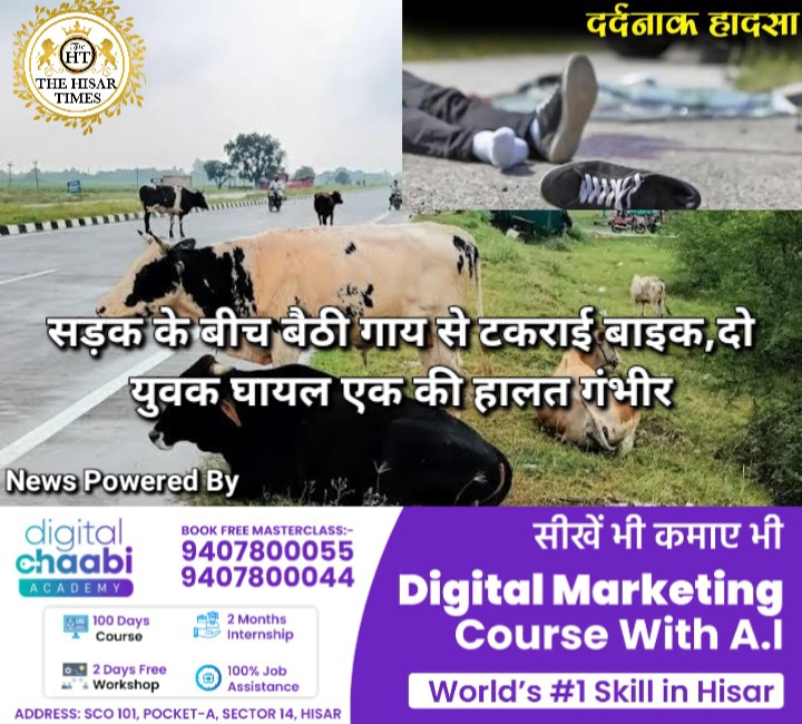 हिसार के एयरपोर्ट चौक के पास सड़क के बीचों-बीच बैठी गाय से एक बाइक टकराकर दुर्घटनाग्रस्त हो गई जिससे बाइक सवार दोनों युवक घायल हो गए आसपास के लोगों ने गंभीर हालत में दोनों को अस्पताल में भर्ती कराया जहां मोहित की हालत गंभीर बताई जा रही है जानकारी के अनुसार मोहित और प्रवीण दोनों 12 क्वार्टर के रहने वाले हैं दोनों ऑटो मार्केट में मिस्त्री का काम करते हैं रविवार रात करीब 8:00 बजे दोनों बाइक पर सवार होकर ऑटो मार्केट से 12 क्वार्टर जा रहे थे एयरपोर्ट चौक के पास पहुंचे तो सड़क के बीच बैठी गाय से बाइक टकरा गई जिस वजह से दोनों नीचे गिर गए और घायल हो गए.