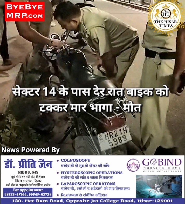 हिसार टाइम्स – सेक्टर-14 व हाउसिंग बोर्ड कॉलोनी रोड पर रविवार देर रात हादसे में बाइक सवार व्यक्ति की मौत हो गई। जानकारी के अनुसार व्यक्ति बाइक पर सवार होकर हिसार की ओर आ रहा था। बताया जा रहा है मृतक का नाम सुधीर था व गांव थूराना का रहने वाला था सेक्टर-14 के पास किसी वाहन ने उसे टक्कर मार दी। अभी तक यह स्पष्ट नहीं हुआ है कि किस वाहन से टक्कर लगी है इस दौरान लोगाें ने पुलिस की 112 नंबर गाड़ी को कॉल किया।