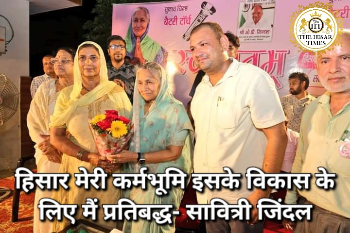 ✍️मेरा परिवार हिसार, टॉर्च के आगे का बटन दबाकर मुझे अवसर दें – सावित्री जिन्दल हिसार टाइम्स-विधानसभा चुनाव में जनता की प्रत्याशी सावित्री जिन्दल ने आज कहा कि हिसार उनका परिवार है और शहर की सेवा एवं विकास के लिए वे प्रतिबद्ध हैं। उन्होंने अपील की कि बैटरी टॉर्च के आगे का बटन दबाकर हिसार … Continue reading हिसार मेरी कर्मभूमि इसके विकास के लिए मैं प्रतिबद्ध- सावित्री जिंदल