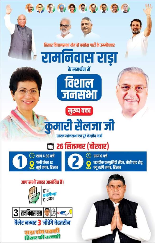 ✍️कांग्रेस सांसद कुमारी सैलजा रामनिवास राड़ा के समर्थन में दो जनसभाओं को करेंगी संबोधित –