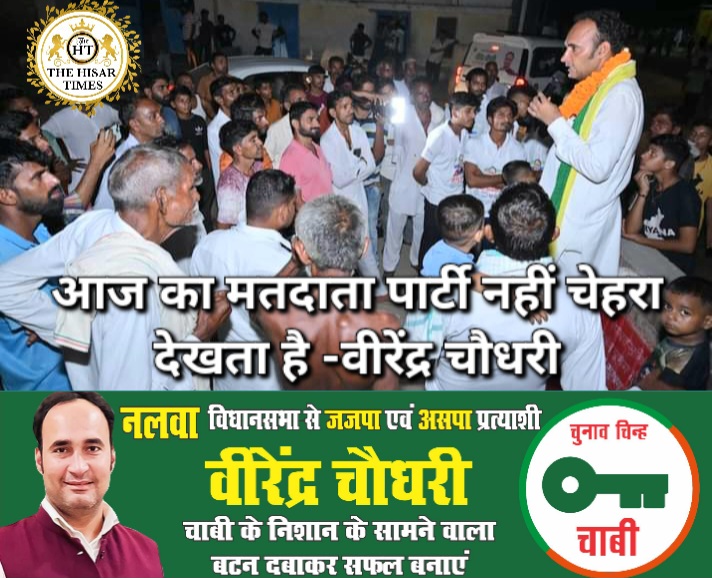 ✍️हल्के में विकास के नए आयाम स्थापित करना ही मेरा मकसद – वीरेंद्र हिसार टाइम्स- जननायक जनता पार्टी से नलवा हल्का प्रत्याशी वीरेंद्र चौधरी ने हल्का वासियो को विश्वास दिलाया कि अगर उन्हें लोगों ने सेवा का मौका दिया तो वह हल्के में विकास के नए आयाम स्थापित करने का काम करेंगे.गौरतलब है कि गुरुवार … Continue reading आज का मतदाता पार्टी नहीं चेहरा देखता है -वीरेंद्र चौधरी