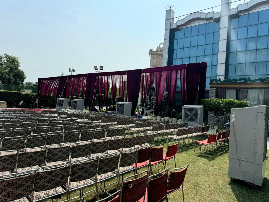 सावित्री जिन्दल की जनसभा के लिए शीशमहल परिसर में हो रही तैयारी।