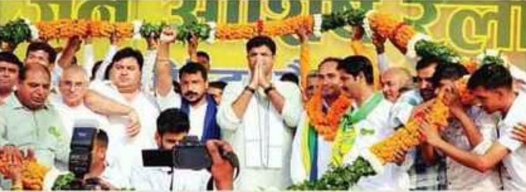 हिसार टाइम्स – जननायक जनता पार्टी की ओर से बुधवार को नलवा के आजाद नगर में हुई जन आशीष रैली ने नलवा विधानसभा क्षेत्र के पूरे राजनीतिक माहौल को बदलकर रख दिया. भारी उमस व गर्मी के बावजूद रैली में उमड़ी भीड़ ने क्षेत्र में सारे राजनीतिक समीकरण की पोल खोल कर रख दी. हालत यह थे की रैली के लिए बनाया गया पांडाल छोटा पड़ गया नलवा के राजनीतिक इतिहास में सबसे सफल रैली की छाप छोड़ गई.इस जन आशीष रैली ने साबित कर दिया कि हलके की जनता इस बार एक बड़े बदलाव के मूड में है, और वह जजपा प्रत्याशी वीरेंद्र चौधरी को अपना आशीष व आशीर्वाद प्रदान कर चुकी है इतनी भारी संख्या में पहुंचकर हलके के लोगों ने वीरेंद्र चौधरी की जीत की ओर इशारा कर दिया.