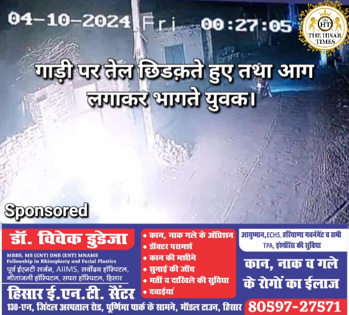 हिसार टाइम्स – हिसार जिला में आदमपुर विधानसभा क्षेत्र से भाजपा प्रत्याशी भव्य बिश्नोई के कार्यक्रम में गए व्यक्ति की गाड़ी अर्बन कू्रजर को 2 युवकों ने जला दिया। युवकों ने इस घटना को कार्यक्रम से भव्य बिश्नोई के जाने के बाद अंजाम दिया। दोनों बाइक पर सवार हो आए थे। पहचान स बचने के लिए दोनों ने अपने मुंह कपड़े से ढके हुए थे। गाड़ी को आग लगाने की सीसीटीवी फुटेज भी सामने आई है। जिसमें युवक गाड़ी पर तेल छिडक़ता और फिर आग लगाते दिख रहा है। इस बारे में भव्य बिश्नोई ने कहा कि इस घटना से उनका कोई लेना-देना नहीं है। पुलिस इस मामले की जांच में जुट गई है।