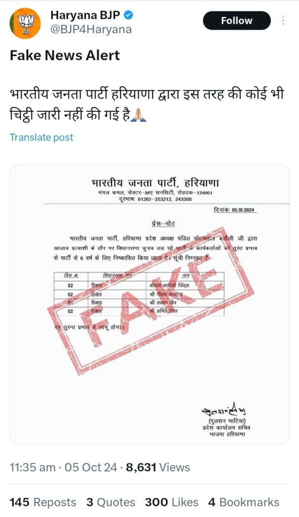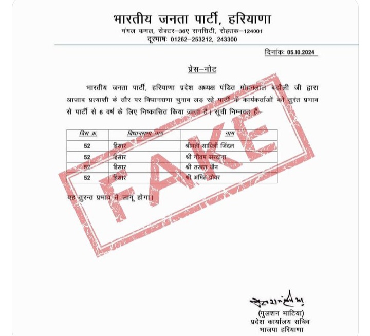 वायरल पोस्ट की सच्चाई सामने आ गई है.हरियाणा में खास तोर पर चुनाव को प्रभावित करने के लिए विधानसभा चुनाव वाले दिन बीजेपी के चार नेताओं को पार्टी से निकालने का एक पोस्ट जमकर वायरल किया गया . इसमें चार निर्दलीय प्रत्याशियों के नाम शामिल हैं. यहीं नहीं इस पोस्ट में बीजेपी के कुरुक्षेत्र से सांसद नवीन जिंदल की मां सावित्री जिंदल का नाम भी है. वायरल पोस्टर को लेकर हरियाणा बीजेपी की तरफ से सच्चाई बताई गई है. एक्स पर पोस्ट कर लिखा गया है कि भारतीय जनता पार्टी हरियाणा की ओर से इस तरह की कोई भी चिट्ठी जारी नहीं की गई है. यह फेक न्यूज़ है
