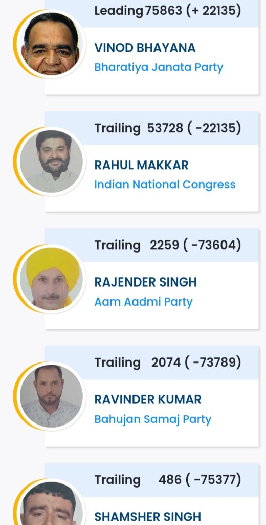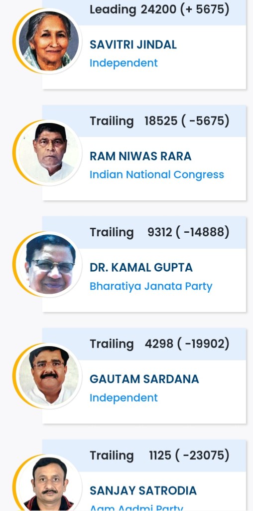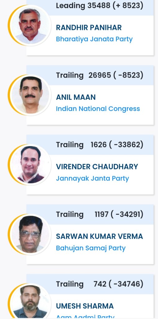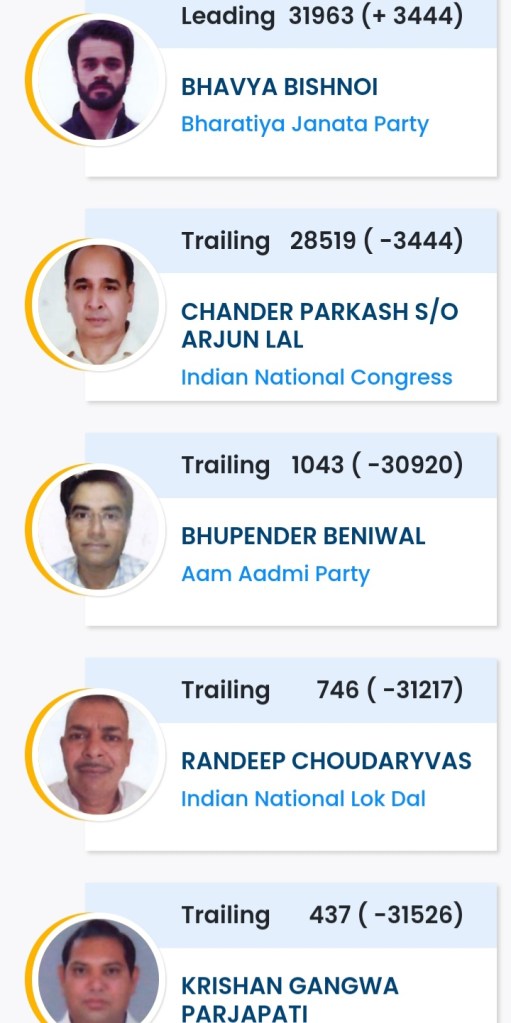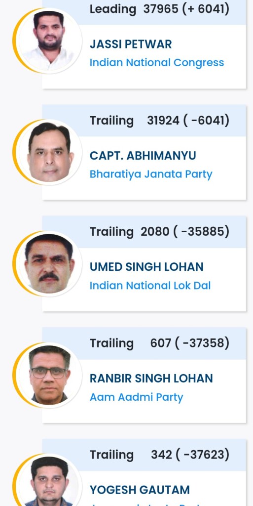 Politics, Top News अब तक की स्थिति बरवाला,हांसी लगभग तय हिसार,नलवा,आदमपुर,नारनौंद मे जंग जारी ! Date: October 8, 2024Author: Puneet Wadhwa ✍️यह जानकारी इलेक्शन कमिशन की साइट के अनुसार है हिसार 6/12 हांसी 14/15 बरवाला 12/13 नलवा 8/13 आदमपुर 7/13 नारनौंद 7/16 Share this: Share on X (Opens in new window) X Share on Facebook (Opens in new window) Facebook Email a link to a friend (Opens in new window) Email Share on WhatsApp (Opens in new window) WhatsApp Share on LinkedIn (Opens in new window) LinkedIn Like Loading... Related