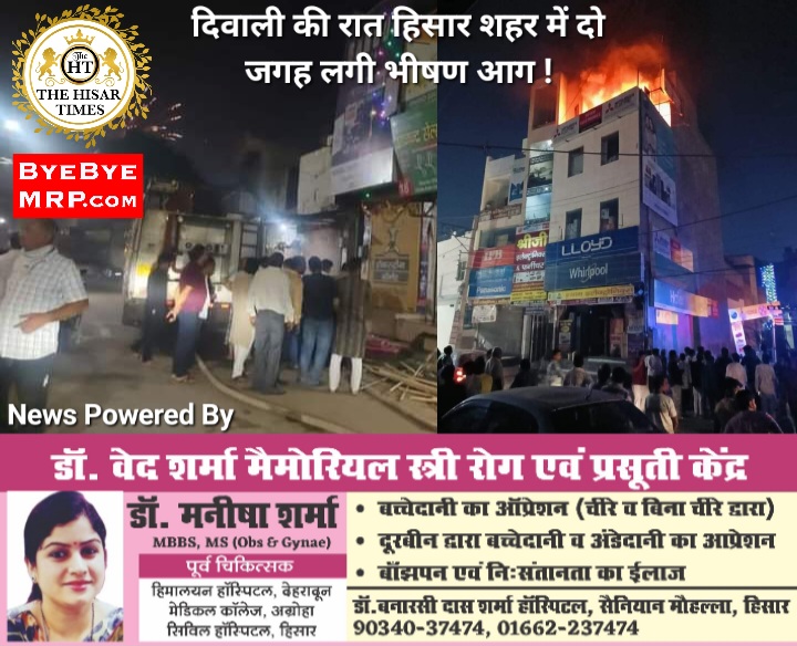 हिसार टाइम्स – हिसार में दिवाली की रात जमकर पटाखे जलाए गए इस दौरान मुल्तानी चौक के नजदीक सैनीयान मोहल्ले में इलेक्ट्रॉनिक शोरूम श्री श्याम इलेक्ट्रॉनिक की चौथी मंजिल पर भीषण आग लग गई.घटना की सूचना मिलने पर फायर ब्रिगेड की चार गाड़ियां मौक़े पर पहुंची और बड़ी मशक्कत के बाद आग पर काबू पाया. घटना करीब रात 11:30 बजे की है.