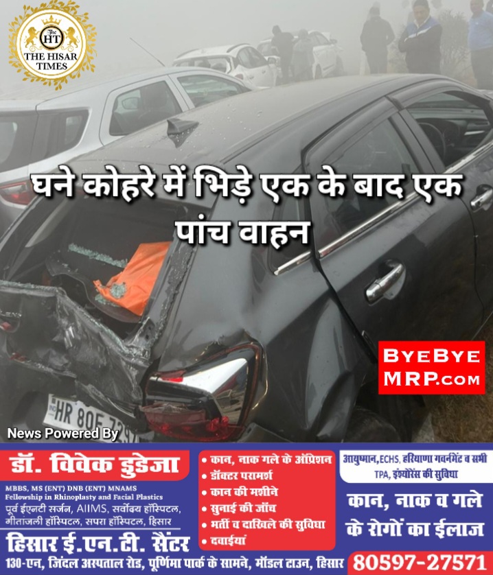 सुबह हिसार-चंडीगढ़ नेशनल हाईवे पर गांव गैबीपुर में स्थित फ्लाई ओवर के ऊपर पांच गाडिय़ां आपस में भिड़ गई। जिस कारण गाडिय़ों में काफी नुकसान हुआ बताया जा रहा है। गाडिय़ों की गति धीमी होने के कारण किसी के हताहत होने की खबर नहीं है। जानकारी के अनुसार एक ट्रक जब फ्लाई ओवर पर जा रहा था, तो अचानक से उसने ब्रेक ले ली। जिससे उसके पीछे चली आ रही एक गाड़ी उससे टकरा गई और जब गाड़ी चालक गाड़ी से उतर कर गाड़ी में हुए नुकसान को देखने लगा तो धुंध में उसके पीछे चली आ रही दूसरी गाडिय़ां भी आपस में टकरा गई। वहीं छोटी गाडिय़ों के पीछे एक बस भी आ रही थी, जो धुंध में दिखाई ना देने कारण इन गाडिय़ों से टकरा गई। फ्लाई ओवर पर गाडिय़ों की स्पीड कम होने के कारण इस गाडिय़ों की भिड़ंत में किसी को गंभीर चोट नहीं आई है।