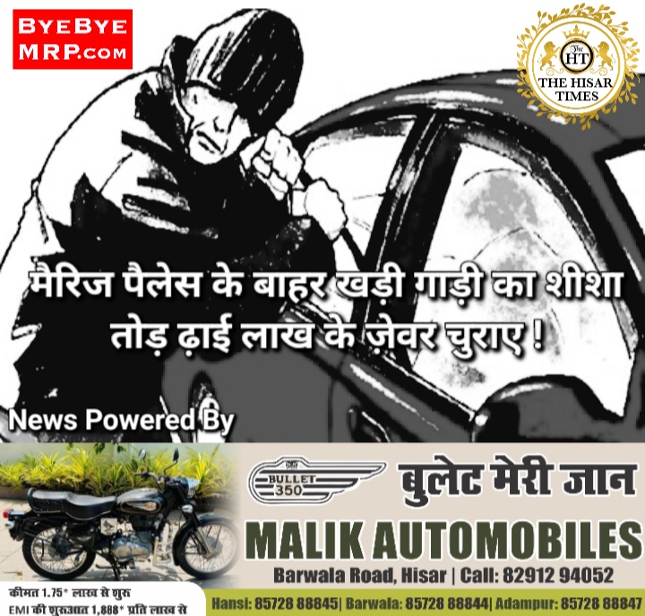 हिसार टाइम्स – हिसार के कैमरी मार्ग स्थित एक मैरिज पैलेस के बाहर खड़ी गाड़ी का शीशा तोड़कर चोर एक हैंडबैग चोरी कर ले गए। हैंडबैग में जेवरात, नकदी और जरूरी दस्तावेज थे। इस संबंध में आजाद नगर थाना पुलिस ने अज्ञात के खिलाफ केस दर्ज किया है।
