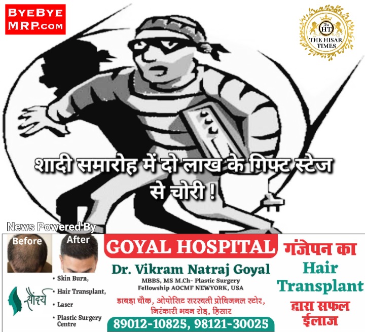 हिसार टाइम्स – हिसार के सिरसा-दिल्ली रोड स्थित ब्लू बर्ड रिसोर्ट में आयोजित रि. लेबर ऑफिसर के एचसीएस बेटे की मैरिज रिस्पेशन में मिले गिफ्ट अज्ञात व्यक्ति चुराकर ले गया। इसका पता स्टेज पर जाकर गिफ्ट संभालने पर चला। इस मामले में सेक्टर 21, मेला ग्राउंड एरिया वासी रि. लेबर ऑफिसर प्रभुदयाल की शिकायत पर पुलिस ने अज्ञात चोरों पर केस दर्ज कर लिया है। रि. लेबर ऑफिसर प्रभुदयाल का बेटा सचिन एचसीएस है, जिसकी शादी की रिसेप्शन का ब्लू बर्ड रिसोर्ट में आयोजन था। 24 नवंबर की रात को रिसोर्ट के लान में कार्यक्रम चल रहा था। देर रात 1.30 बजे स्टेज पर बेटे को मेहमानों ने गिफ्ट दिए थे। सामने ही टैंट में भोजन का प्रबंध था। सुबह 7 बजे स्टेज पर जाकर गिफ्ट्स पैक संभाले तो चोरी हुए मिले। इनमें तांबे का डिनर सेट कपड़े बर्तन इत्यादि करीब 2 लाख कीमत के गिफ्ट थे !