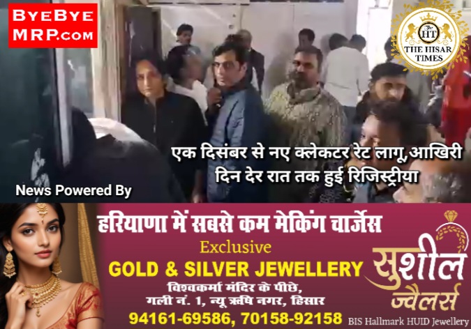 हिसार टाइम्स – प्रदेश में एक दिसंबर से नए क्लेकटर रेट लागू होंगे। नए क्लेकटर रेट में 50 प्रतिशत तक बढ़ोतरी की संभावना है। जिसको देखते हुए आखिरी दिन शुक्रवार को तहसील कार्यालय में देर रात तक रजिस्टि्रयां होती रहीं। कुछ लोगों ने तत्काल सेवा के तहत 25 हजार रुपये का टोकन लेने रजिस्ट्री करवाई। अब विभाग के ऑप्रेटर ने नए कलेक्टर रेट को अपडेट करने का काम शुरु कर दिया है।