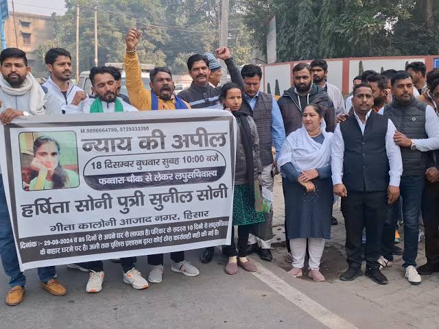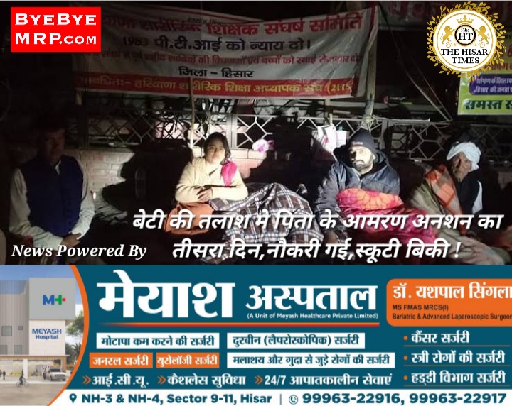 हिसार टाइम्स – हिसार लघु सचिवालय के बाहर बीते 3 दिन से आमरण अनशन पर बैठे पिता व उसका परिवार न्याय के गुहार लगा रहा है बेटी की मां रागनी ने बताया कि 80 दिन से अधिक हो गए है बेटी का सुराग नहीं है। पति निजी नौकरी करते थे, जो छूट चुकी है। बेटी की तलाश करने और घर खर्च के लिए रुपयों की जरूरत थी तो 20 हजार रुपये में स्कूटी बेचनी पड़ी। हालात ये है कि मकान का किराया देने के लिए भी रुपये नहीं है। जब तक बेटी नहीं मिल जाती उनका धरना और अनशन जारी रहेगा।