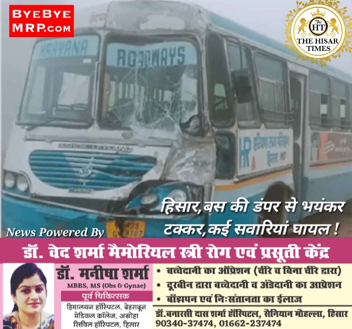 हिसार टाइम्स – इस वक्त पूरा हरियाणा घने कोहरे की चपेट में है,शुक्रवार को पूरा दिन आसमान में धुंध छाई रही। जिस वजह से रोडवेज की एक बस डंपर से जा टकराई बस में 70 से अधिक सवारियां सवार थी गनीमत यह रही की जान माल का नुकसान नहीं हुआ, कोहरा होने के कारण विजिबिलिटी मात्र 5 मीटर ही रहने की वजह से वाहन चालकों को काफी परेशानियों का सामना करना पड़ा।