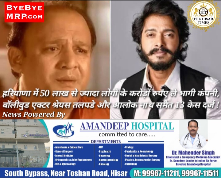 हिसार टाइम्स – हरियाणा के सोनीपत में बॉलीवुड एक्टर श्रेयस तलपड़े और आलोकनाथ समेत 13 लोगों के खिलाफ एफआईआर दर्ज की गई है.सोनीपत में दर्ज की गई एफआईआर के मुताबिक मध्यप्रदेश के इंदौर में रजिस्टर्ड ह्यूमन वेलफेयर क्रेडिट कोऑपरेटिव सोसाइटी 50 लाख से ज्यादा लोगों के करोड़ों रुपए लेकर भागने से जुड़ा हुआ है। दोनों बॉलीवुड एक्टर्स ने इस कंपनी में इन्वेस्टमेंट के लिए प्रमोशन किया था। यही नहीं,