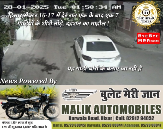 हिसार टाइम्स – हिसार के सेक्टर 16/17 में 3 से 4 बेखौफ गाड़ी सवार चोरों ने एक के बाद एक 7 गाड़ियों के शीशे तोड़ बैटरियां वह अन्य सामान चोरी कर लिया, जानकारी के अनुसार चोरों ने ब्रेजा, i20, स्कोडा,बलेनो, बोलेरो,हरियर,जेन एस्टीलो आदि गाड़ियों के शीशे तोड़े है, पीड़ित सेक्टर 16/17 निवासी रिटायर्ड बैंक कर्मचारी ने बताया कि उनके पास तीन गाड़ियां हैं, जब चोरों ने एक गाड़ी का शीशा तोड़ा तो शोर सुनकर वह बाहर भागे,