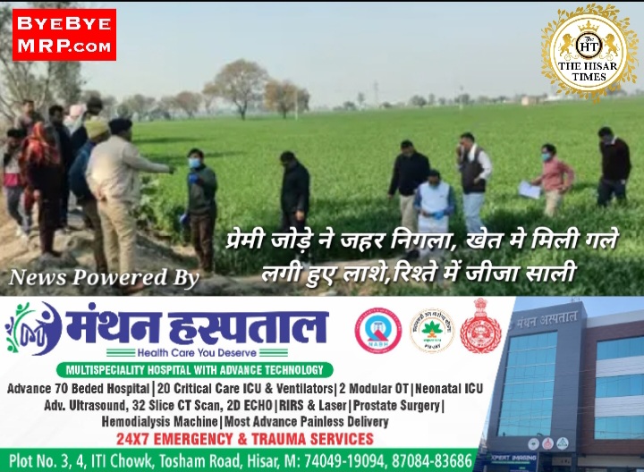 हिसार टाइम्स – हिसार में शुक्रवार को प्रेमी जोड़े ने जहर निगलकर सुसाइड कर लिया। दोनों की लाश मोठ गांव में खेत में पड़ी हुई मिली। दोनों ने एक दूसरे को गले लगाया हुआ था। वहां उनका बैग भी पड़ा मिला, जिसमें कुछ डॉक्यूमेंट और जहरीली दवा की शीशी थी। युवक 25 तो युवती 21 साल की है पुलिस के मुताबिक हिसार के नारनौंद क्षेत्र में स्थित गांव मोठ के पास प्रदीप कुमार का खेत है। गुरुवार रात को प्रदीप ने खेत में पानी लगाया था।
