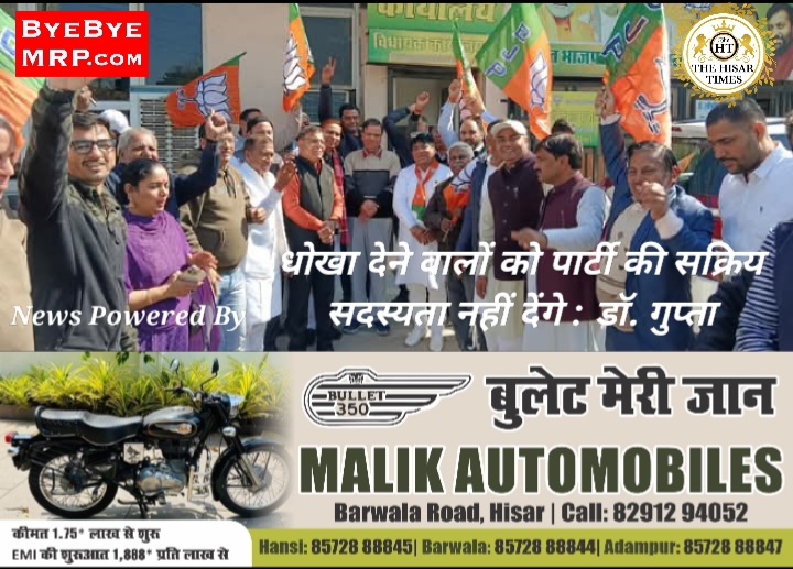 हिसार टाइम्स – मीडिया से बातचीत करते हुए डॉ कमल गुप्ता ने कहा कि जिन लोगों ने पार्टी के साथ धोखा किया, उनको किसी सूरत में सक्रिय सदस्य नहीं बनाया जाएगा। हमारी पार्टी के अध्यक्ष का साफ निर्देश है कि विधानसभा चुनाव में पार्टी के साथ धोखा करने वालों को सहन नहीं किया जाएगा। भाजपा अनुशासित दल है। इसमें हर एक कार्य के लिए प्रोटोकोल बना हुआ है। किस को सदस्यता दी जाए, किसको नहीं, इसके लिए पूरी प्रक्रिया के आधार पर फैसला होता है।
