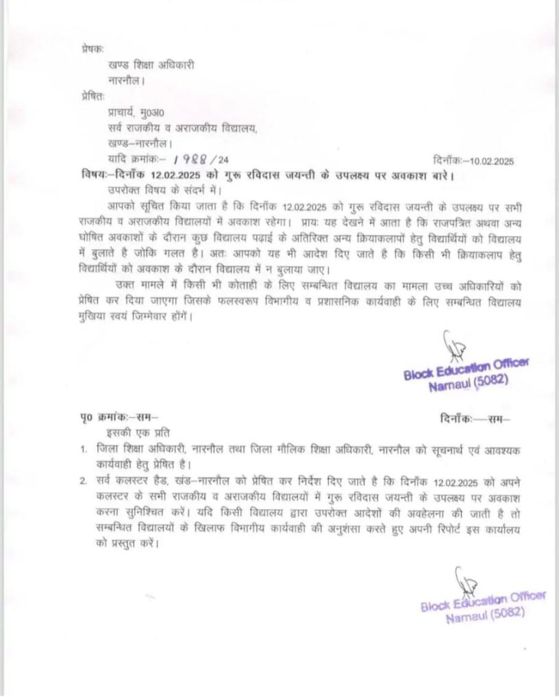 हिसार टाइम्स – हरियाणा में बुधवार 12 फरवरी को रविदास जयंती के अवसर पर प्रदेश के सभी निजी और सरकारी स्कूलों में छुट्टी रहेगी। इस दिन स्कूल संचालक किसी भी बहाने से बच्चों को स्कूल में नहीं बुलाएंगे। इसके लिए शिक्षा विभाग ने पत्र जारी कर निजी स्कूल संचालकों को सख्त हिदायत दी है कि वे इस दिन स्कूल की छुट्टी रखें। अवकाश नहीं रखने वाले स्कूल संचालकों के खिलाफ सख्त कार्रवाई की जाएगी।
