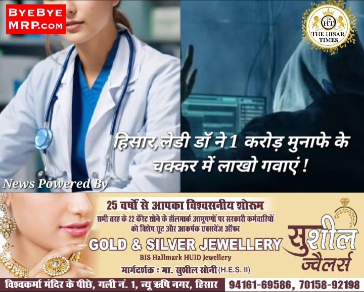 हिसार टाइम्स – हिसार के CMC हॉस्पिटल की लेडी डॉक्टर 21 हजार रुपए लगा के डेढ़ महीने में एक करोड़ मुनाफे के चक्कर में फंस गई। हॉस्पिटल में कंसल्टेंट फिजियोथेरेपिस्ट तैनात डॉ. स्वाति सहगल ने इंस्टाग्राम पर बुल मार्केट ट्रेडिंग का विज्ञापन देखा। इसके बाद इसमें इन्वेस्टमेंट कर दी।हालांकि डेढ़ करोड़ मुनाफे के चक्कर में ठगों ने उनसे 3.83 लाख रुपए ठग लिए।