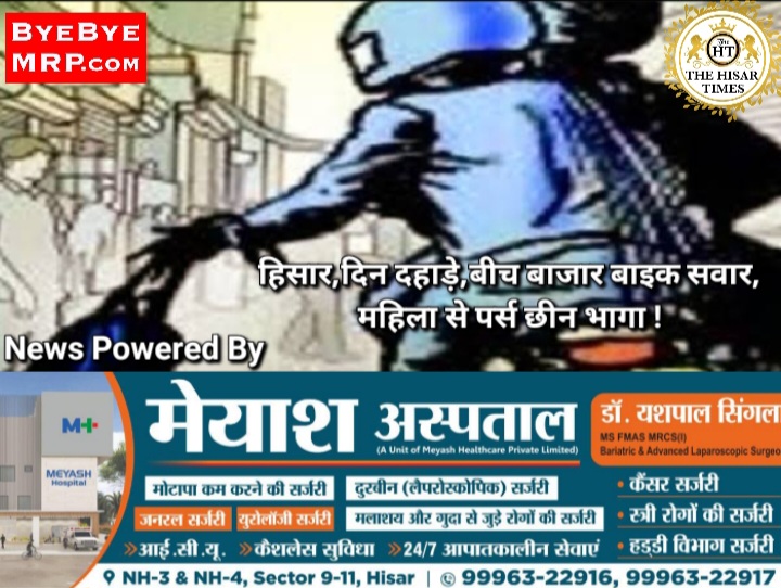 हिसार टाइम्स – हिसार के भीड़ भाड़ वाले क्षेत्र पारिजात चौक के पास बुधवार सुबह करीब साढ़े 11 बजे बाइक सवार युवक स्कूटी के पीछे बैठी महिला के हाथ से पर्स छीनकर भाग निकला। पर्स में 15 हजार रुपये और एक स्मार्ट घड़ी थी।